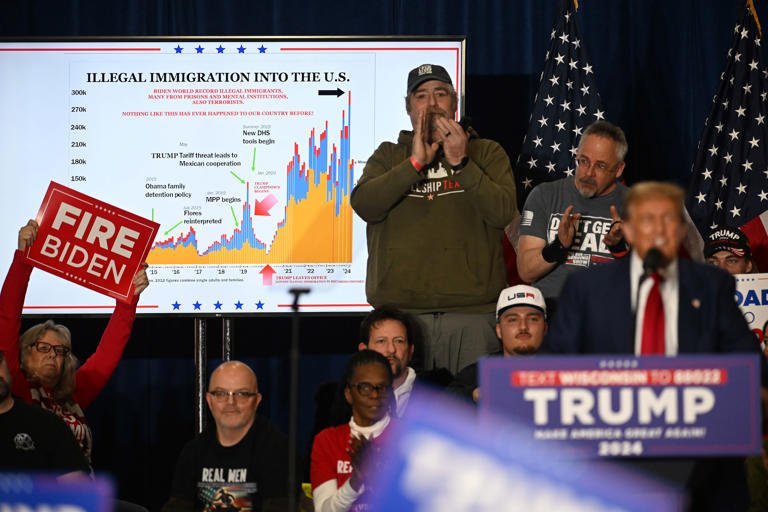 … that Trump claimed was evidence that he had controlled immigration and the Biden administration did not. Trump has been using this chart a lot since he claims God saved him from an assassin’s bullet as he was presenting it. The red arrow at the bottom, according to Trump, was his “last day in office”.